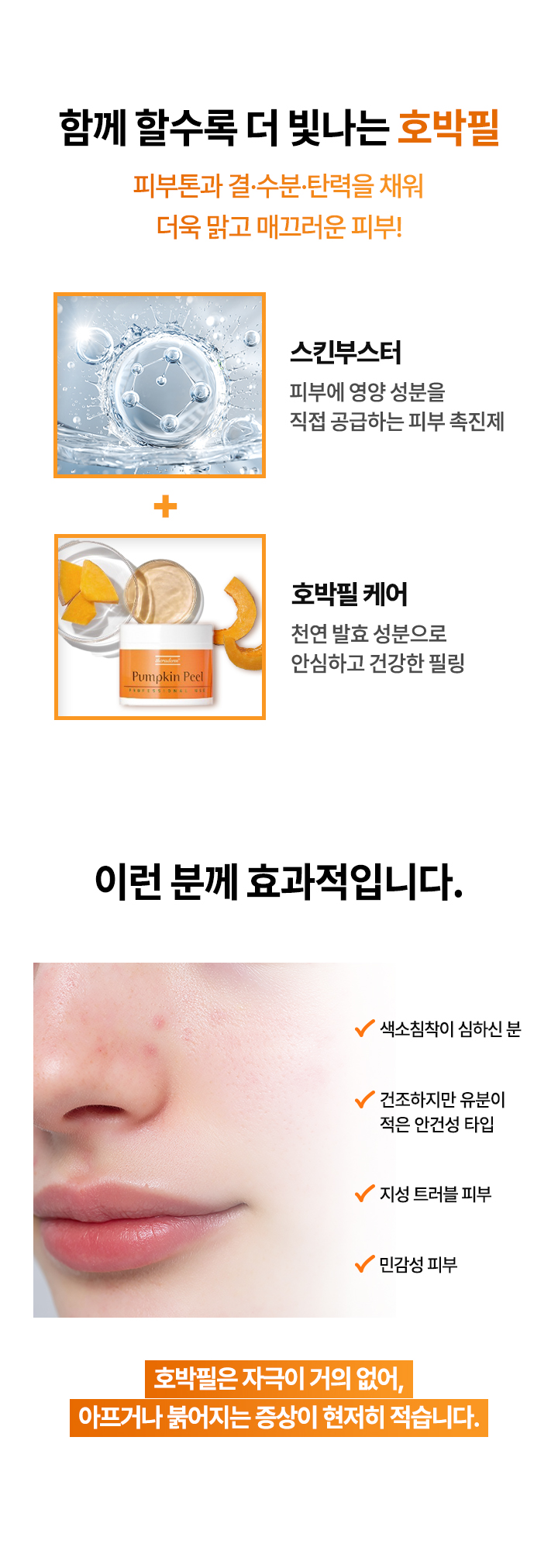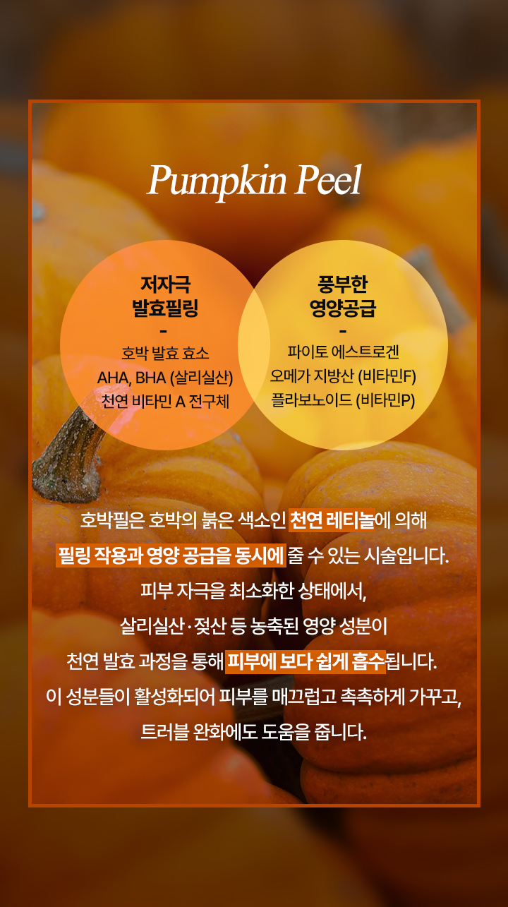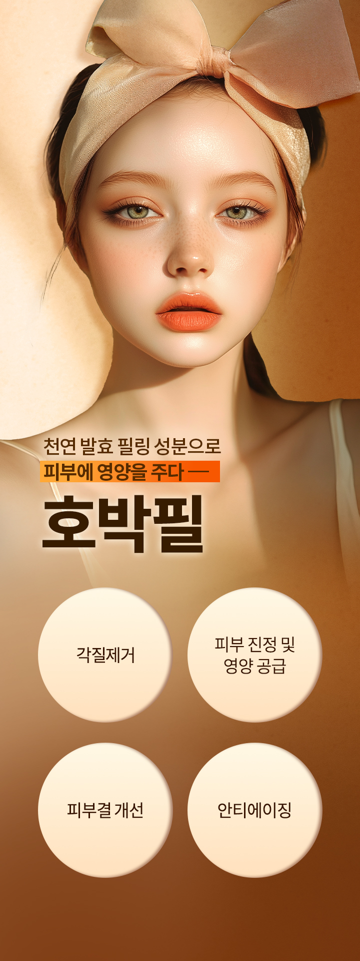 호박필은 호박의 붉은 색소인 천연 레티놀에 의해 필링 작용과 영양 공급을 동시에 줄 수 있는 시술입니다. 피부 자극을 최소화한 상태에서, 살리실산·젖산 등 농축된 영양 성분이 천연 발효 과정을 통해 피부에 보다 쉽게 흡수됩니다. 이 성분들이 활성화되어 피부를 매끄럽고 촉촉하게 가꾸고, 트러블 완화에도 도움을 줍니다.