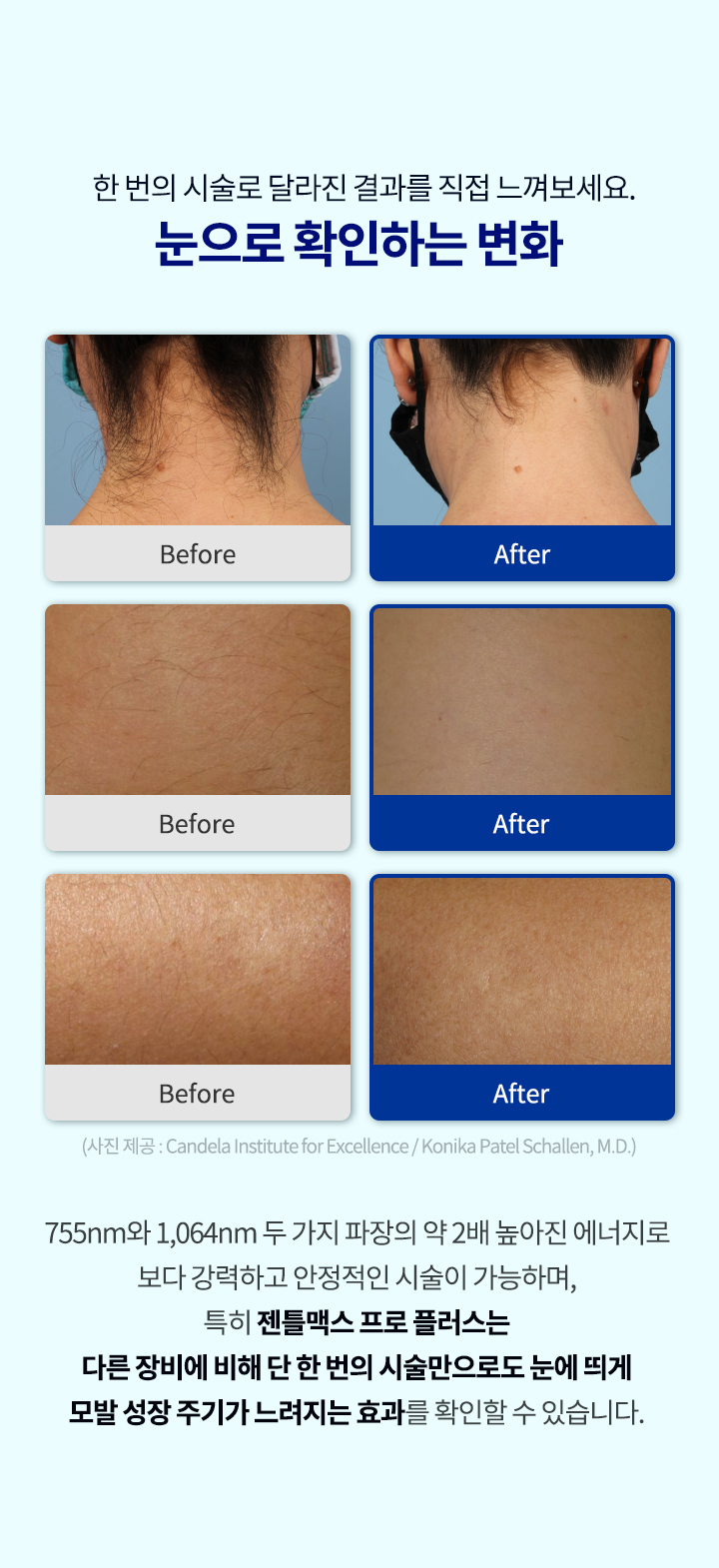 755nm와 1,064nm 두 가지 파장의 약 2배 높아진 에너지로 보다 강력하고 안정적인 시술이 가능하며, 특히 젠틀맥스 프로 플러스는 다른 장비에 비해 단 한 번의 시술만으로도 눈에 띄게 모발 성장 주기가 느려지는 효과를 확인할 수 있습니다.